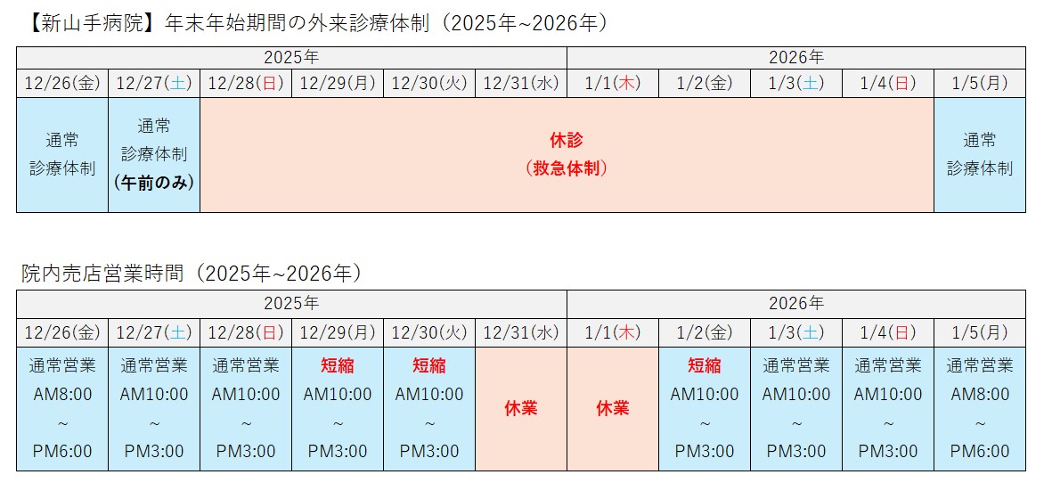 年末年始期間中の外来診療体制および院内売店の営業時間につきまして(2025年~2026年)